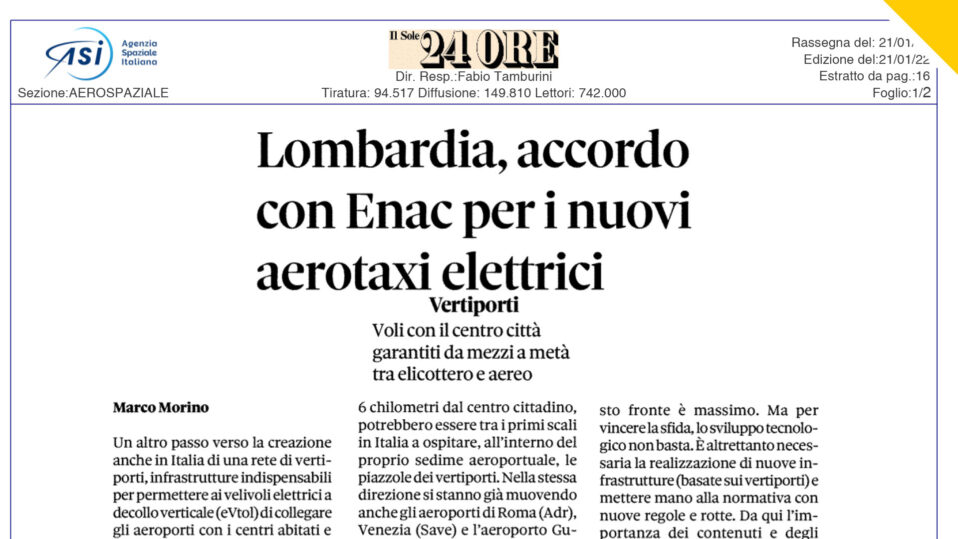 Cruciale firma ieri tra Regione Lombardia ed ENAC-Ente Nazionale per l’Aviazione Civile. Tra le due parti è stato siglato il Protocollo d’intesa sulla Mobilità Aerea Avanzata, “un passo fondamentale per valorizzare lo sforzo tecnologico delle imprese”, come ha dichiarato Angelo Vallerani, Presidente del Lombardia Aerospace Cluster nonché Responsabile Institutional Relations…...